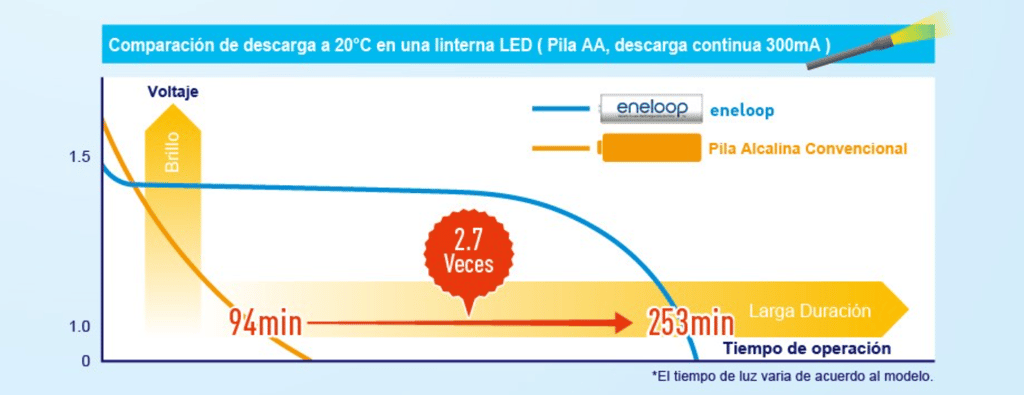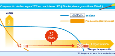 Para extender su vida útil, eneloop proporciona un voltaje constante desde su carga completa hasta su agotamiento. Esto ayuda a incrementar el lapso de tiempo entre recargas. A diferencia de las baterías de celda seca, que pueden proporcionar una alta ráfaga de voltaje inicial antes de agotarse, eneloop está diseñada para proporiconar un voltaje inicial más bajo, lo cual es mejor para verificar si su dispositivo requiere muy alto voltaje antes de su adquisición.