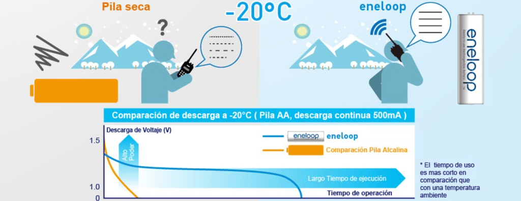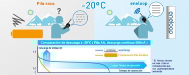 Para los usuarios que viven en climas fríos, y para aquellos que disfrutan las actividades en espacios abiertos tales como esquiar o acampar, simplemente no existen baterías con mejor desempeño en condiciones de clima frío. A diferencia de otras baterías, las eneloop proporcionan un excelente desempeño a 0°C, e inclusive pueden utilizarse en temperaturas tan bajas como -20°C.